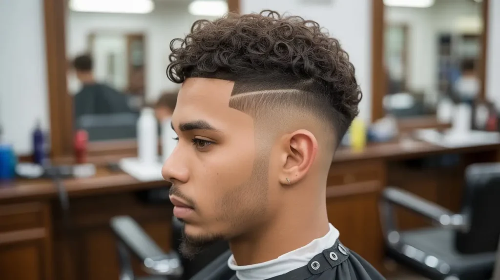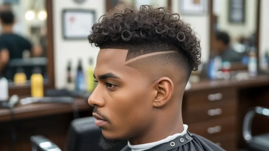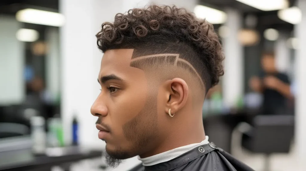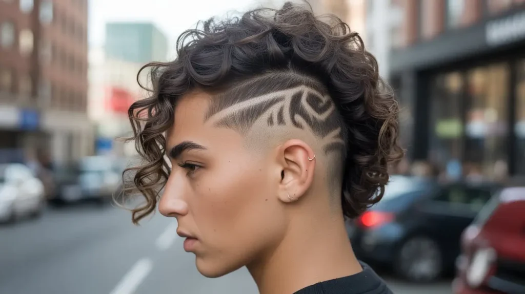 Okay, you want to turn heads? Let’s turn your scalp into a canvas. The Curly Mohawk with Shaved Design Sides incorporates hair art—lines, geometric shapes, lightning bolts, or even floral patterns shaved into the faded sides.