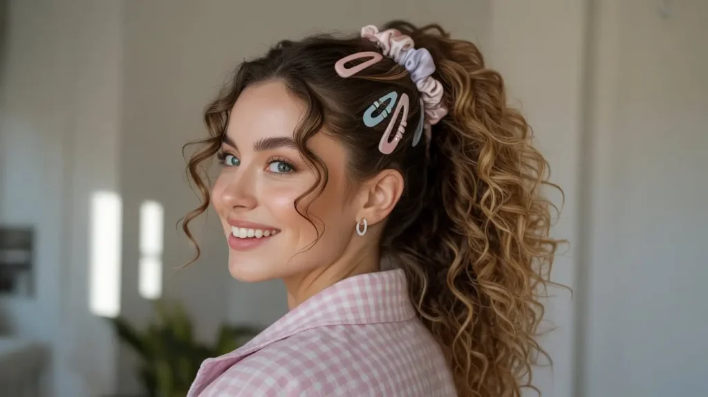 11. Curly Ponytail with Accessories: Scrunchies & Clips