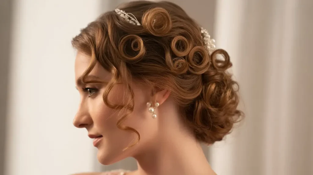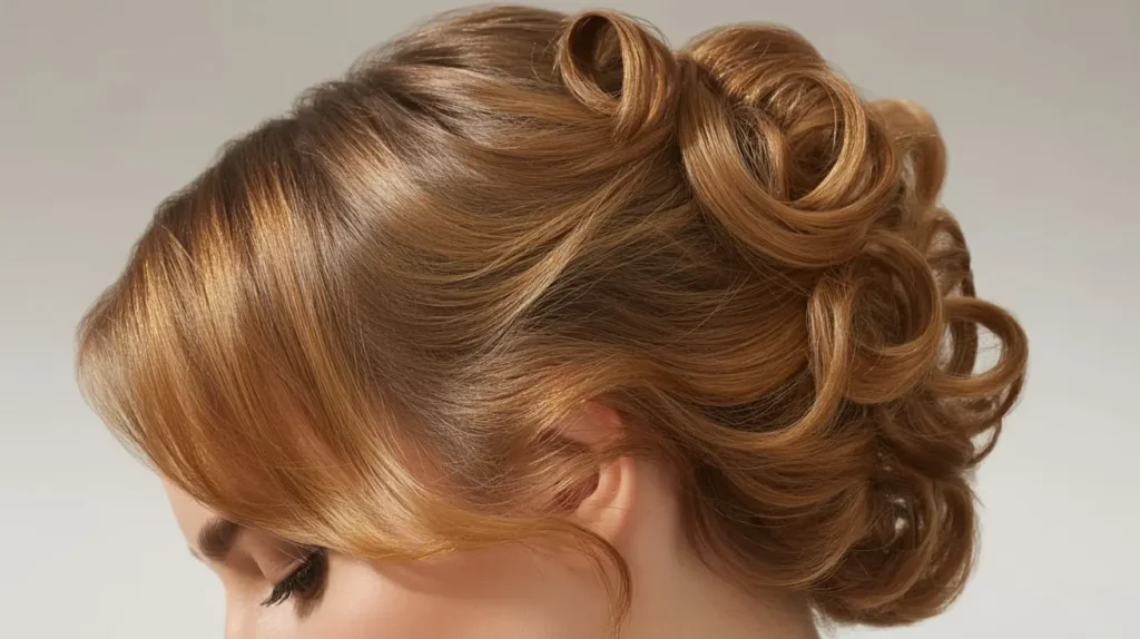 Roll the hair back toward the center, creating a vertical cylinder. Pin it in place. Instead of tucking the top ends in smoothly, let the curls spill over the top. It adds height and drama.