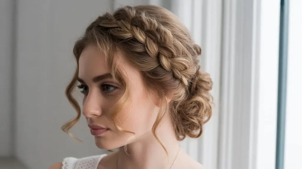7. Curly Updo with Braided Crown