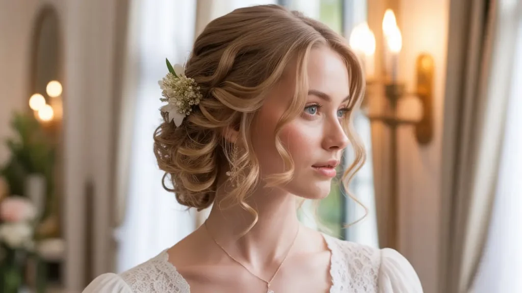 Weddings require a balance. You want to look formal, but you don’t want to look like you’re wearing a costume. A loose curly updo bridges this gap perfectly. It’s soft, ethereal, and photographs beautifully.