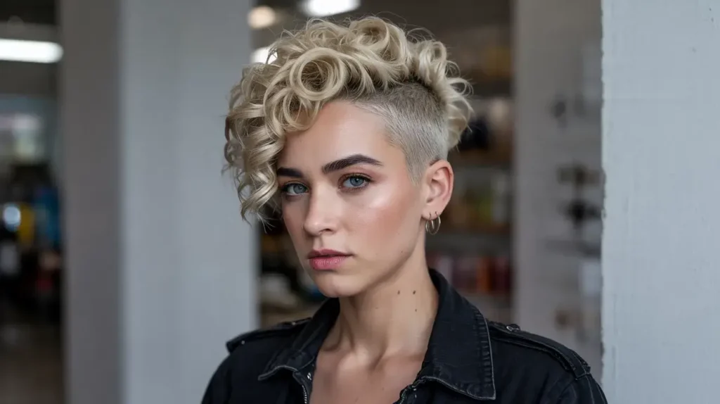 Ready to channel your inner rockstar? The curly mohawk, or “Fro-hawk,” is surprisingly easy to achieve on short hair. You don’t actually have to shave your sides (unless you want to, which is also a total vibe). You can create a faux-hawk by slicking the sides of your hair upward toward the center of your head and securing them with pins or small combs.