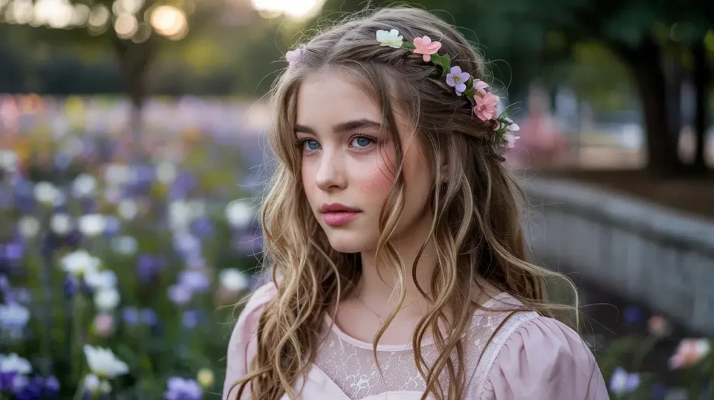 The base can be any half up half down variation, but the flowers are what make this style special. You can tuck small blooms into the secured section, create a flower crown effect, or scatter individual flowers throughout. I personally love using baby’s breath for a delicate, ethereal look, or small roses for something more dramatic.