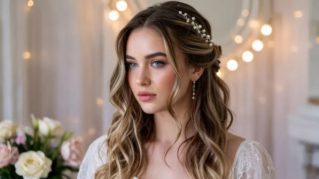This one’s my absolute go-to recommendation for anyone who wants classic elegance without looking like they’re trying too hard. The soft glam curled half up half down style gives you that red-carpet vibe while keeping things relaxed and romantic.