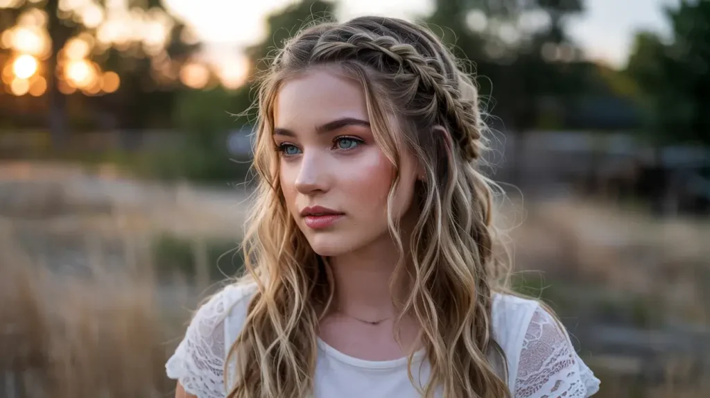 This style pairs perfectly with flowy, romantic dresses or anything with lace and natural fabrics. It’s also great if you’re having an outdoor prom or a garden party vibe. The braids help control flyaways while maintaining that carefree aesthetic.