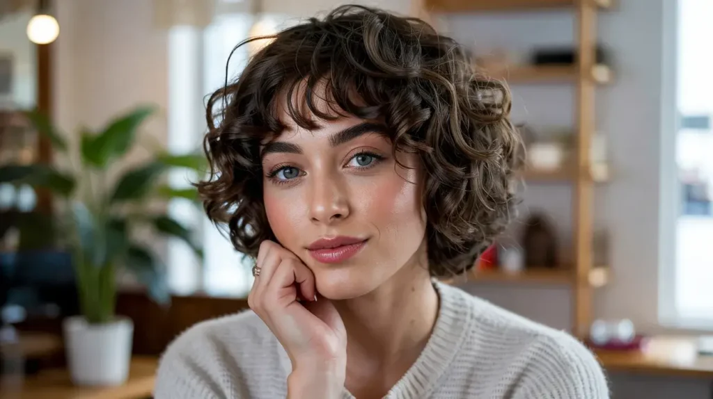 14. Short Curly Bangs Look