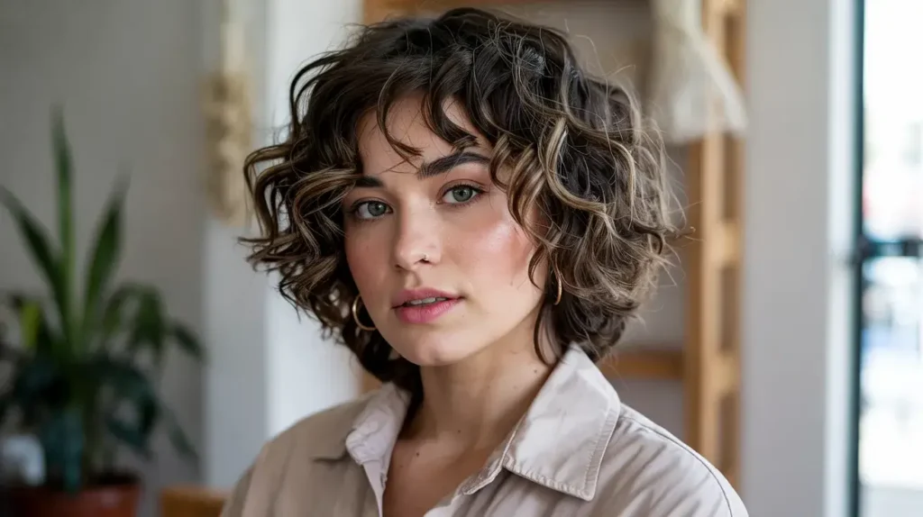 7. Short Curly Cut with Baby Bangs